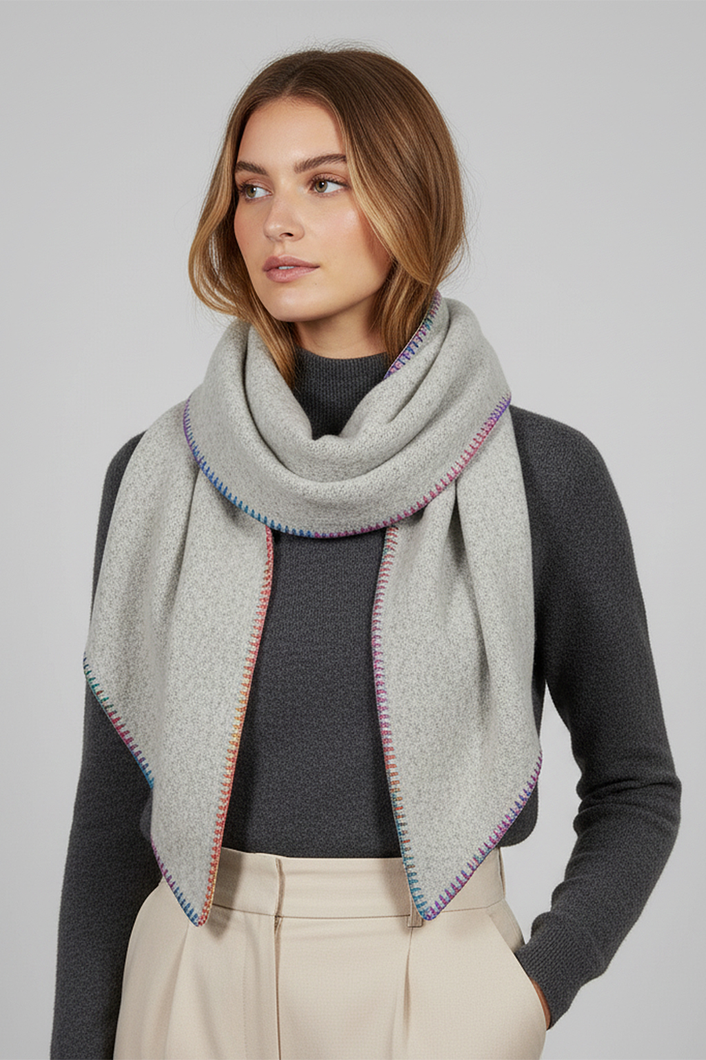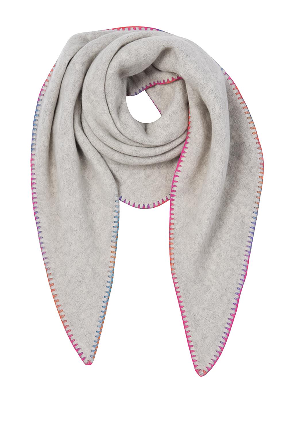 Weicher Schal in Dreiecksform mit farbiger Zierstichkante – modern und vielseitig.