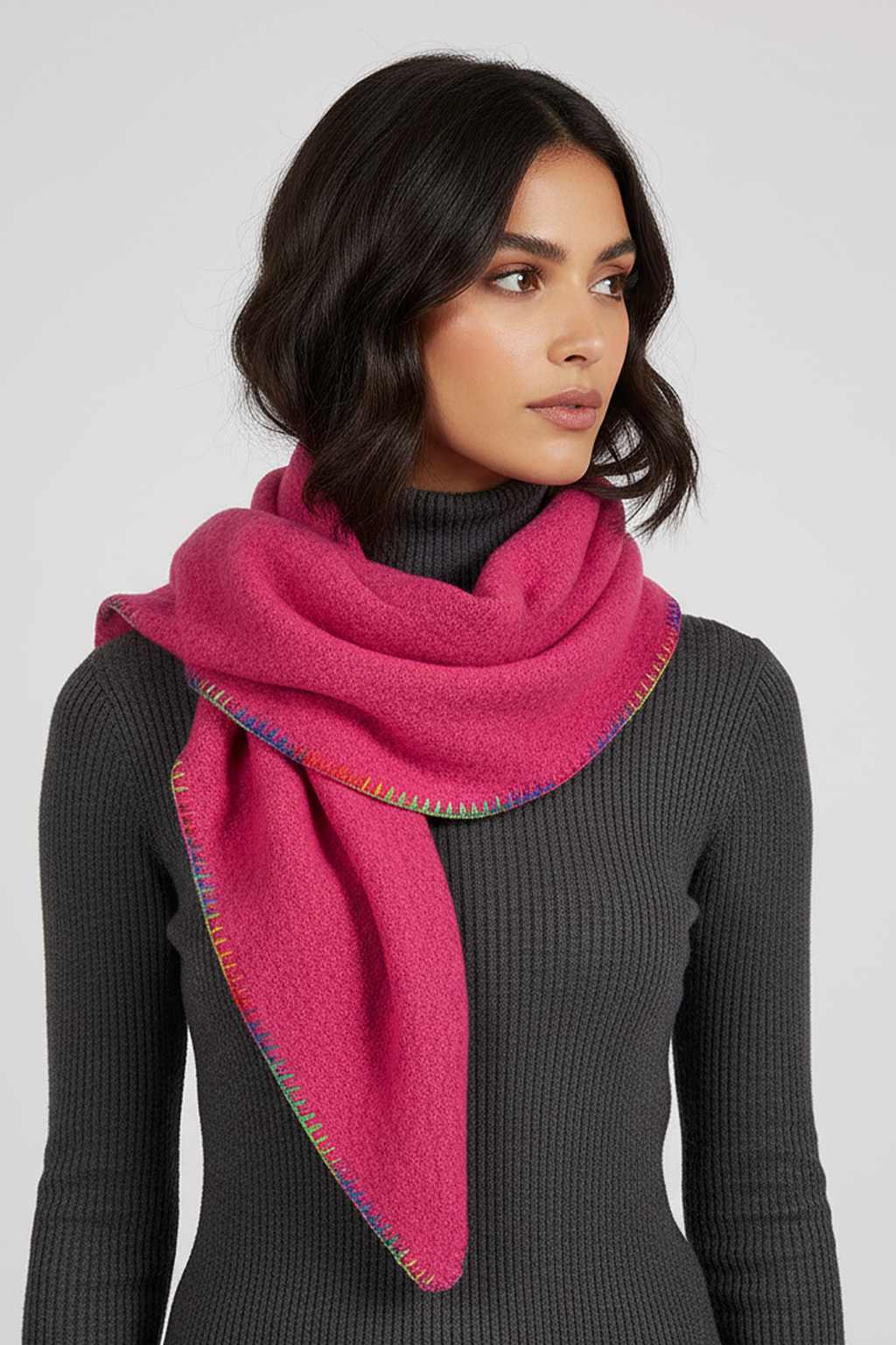 Weicher Schal in Dreiecksform mit farbiger Zierstichkante – modern und vielseitig.