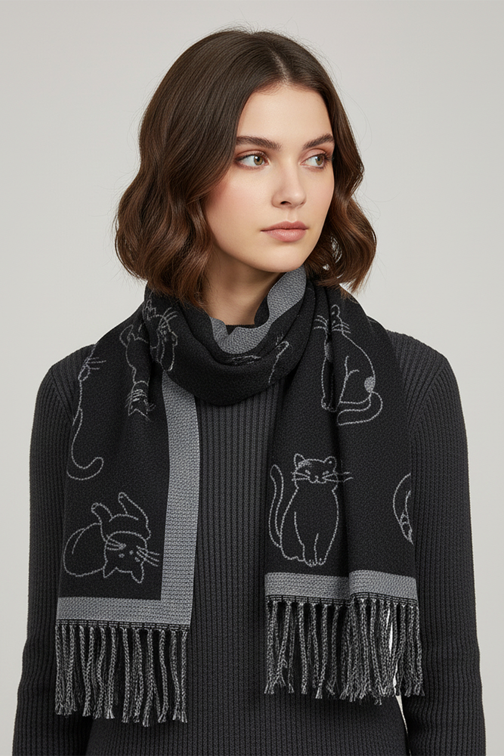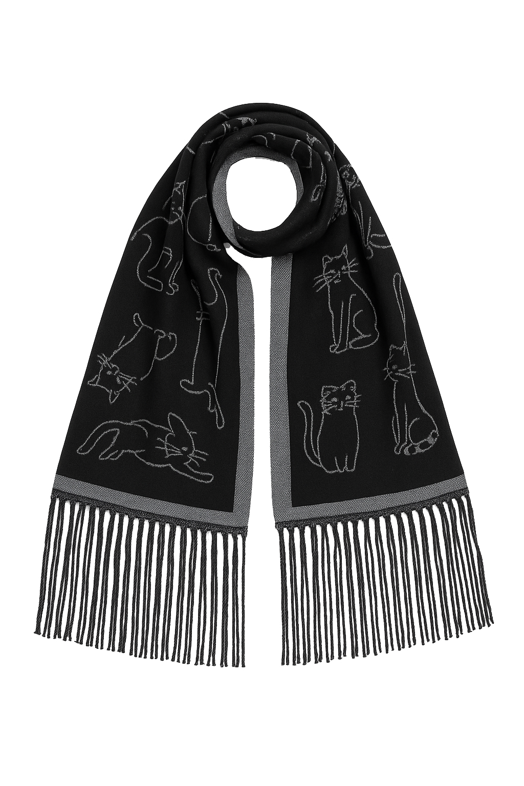 Verspielt und weich – der FAERA Schal mit stilisierten Katzenmotiven bringt Charme in jedes Outfit.