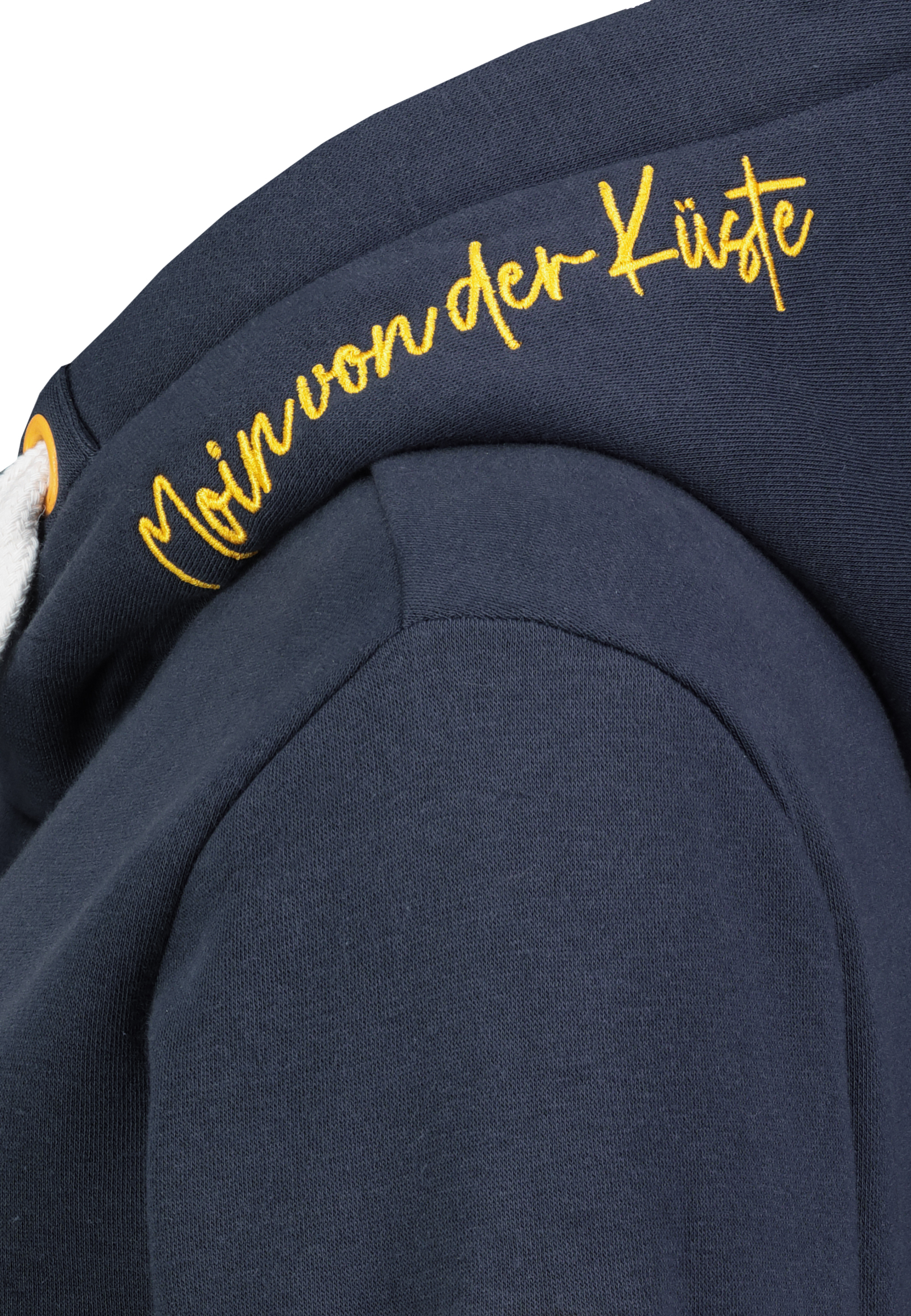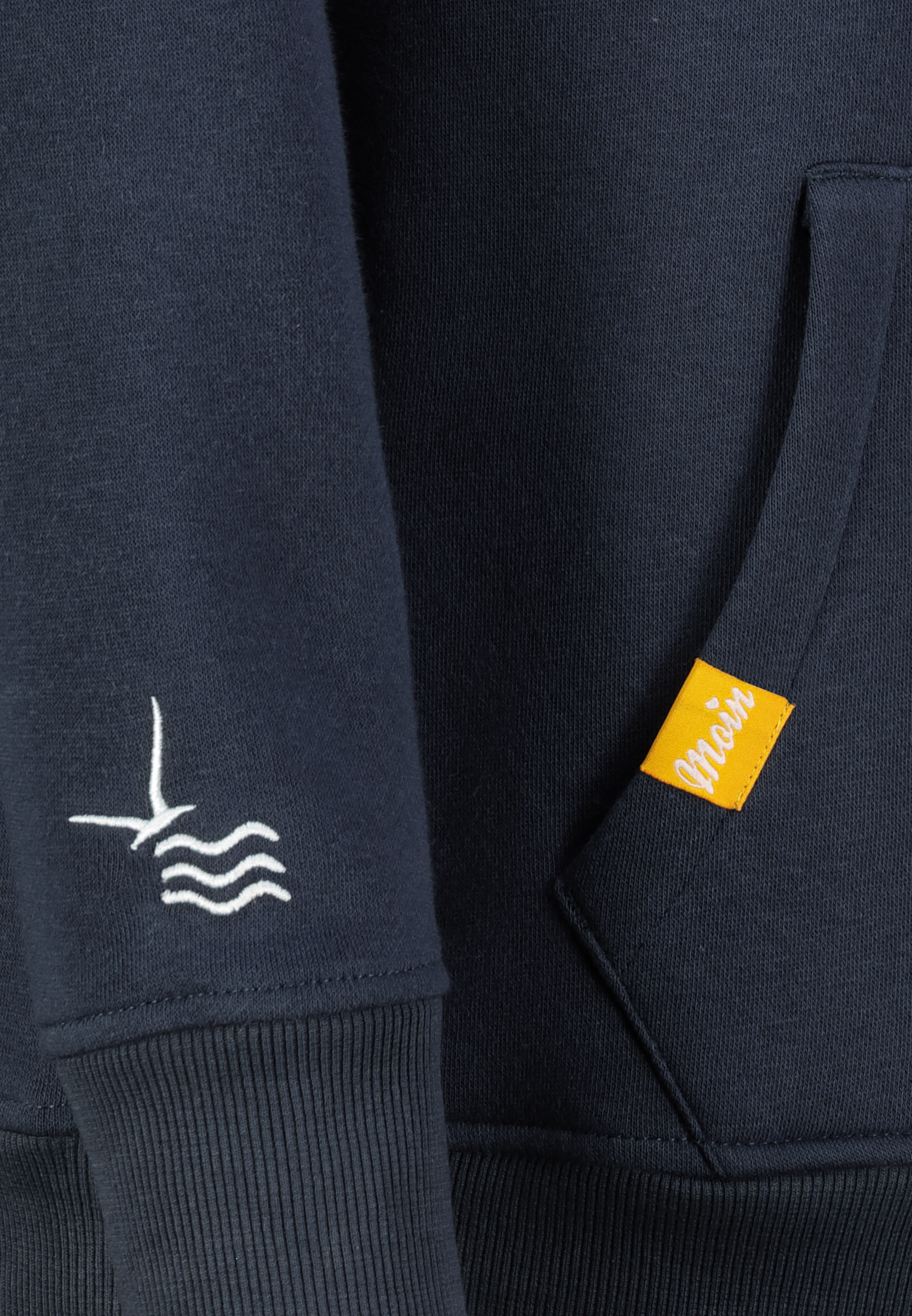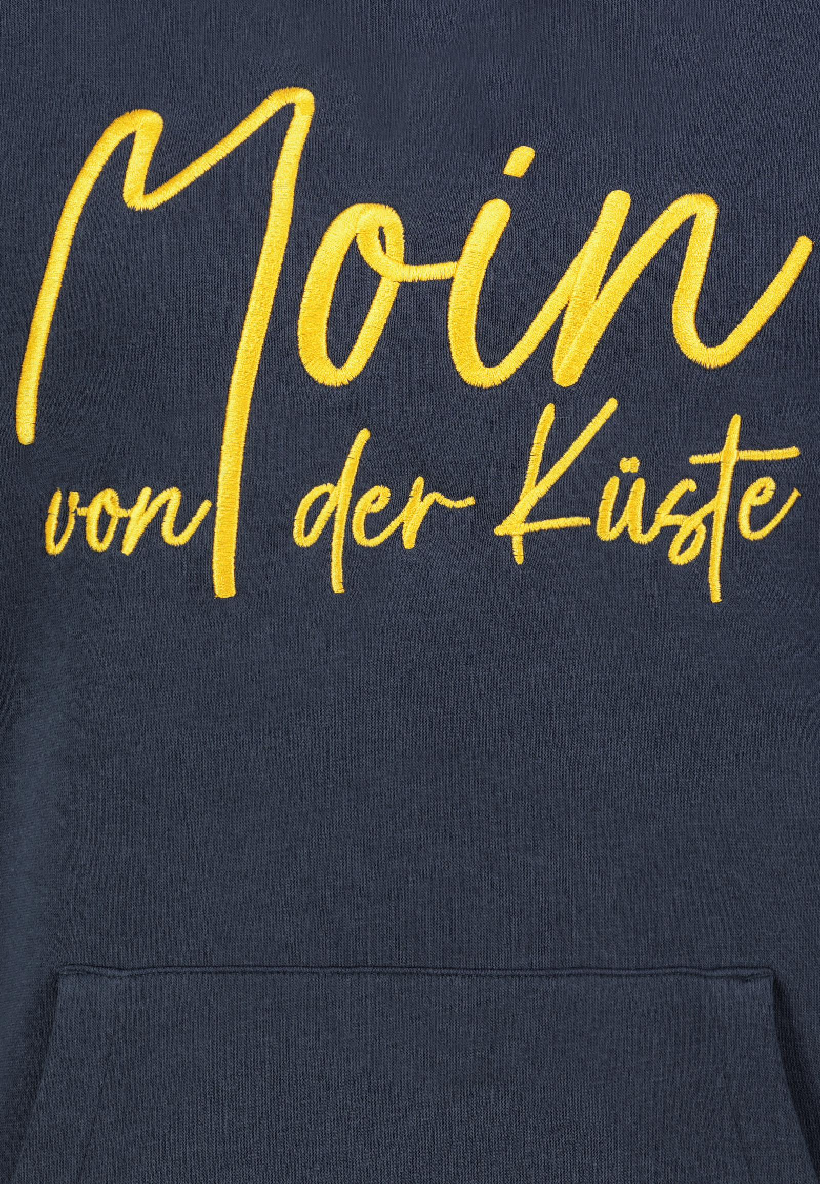 - Moderner Hoodie-Style mit auffälligem Schriftzug: Moin von der Küste.