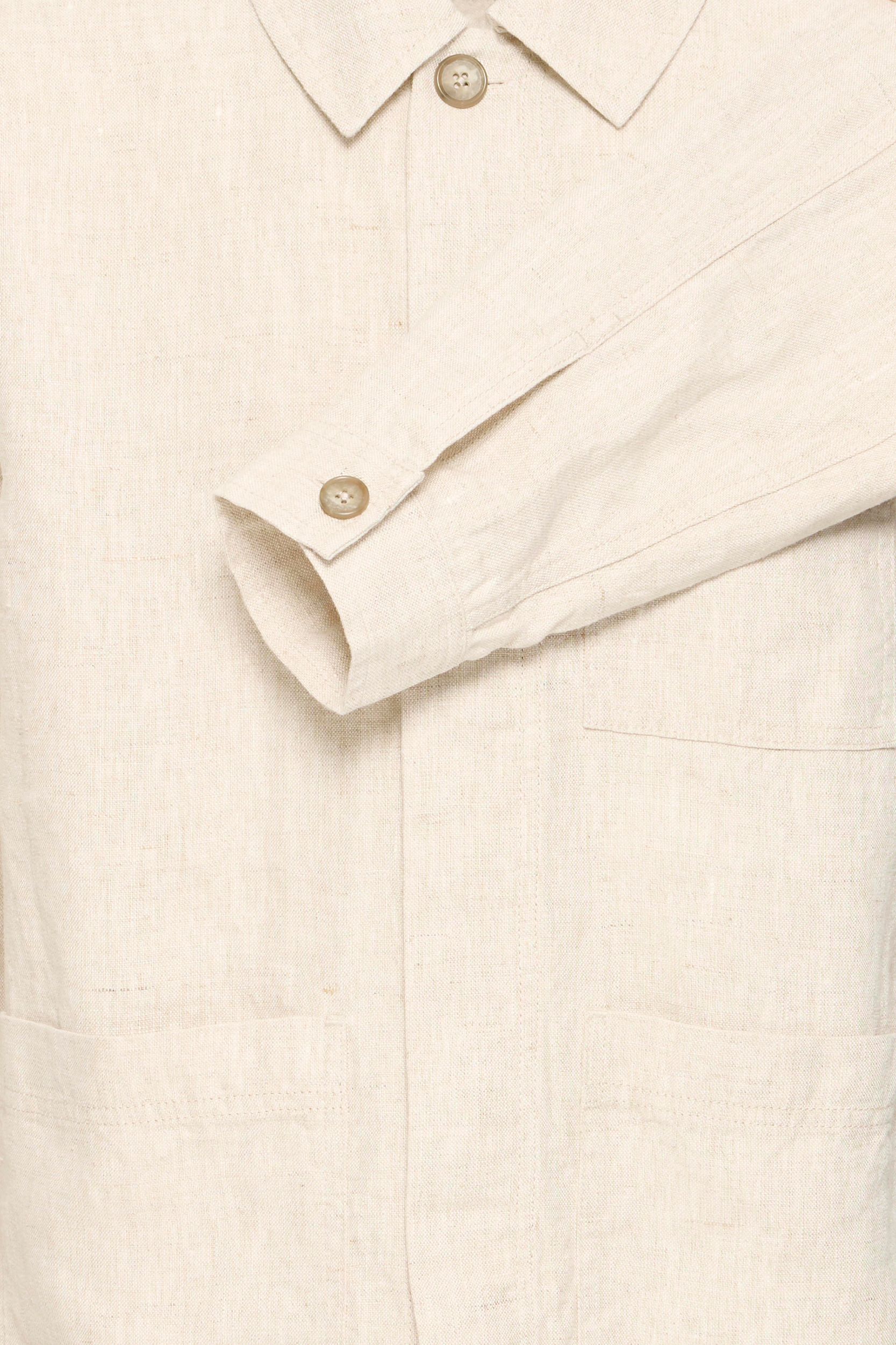 Die Jacke ist aus Leinen gefertigt, was für einen angenehmen Tragekomfort sorgt.