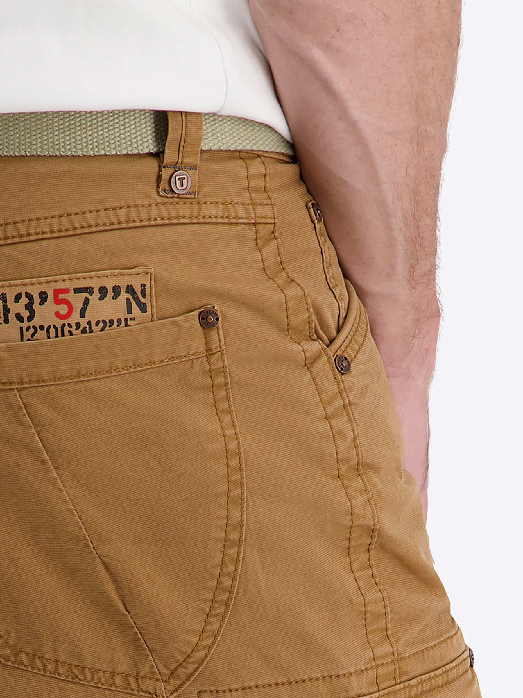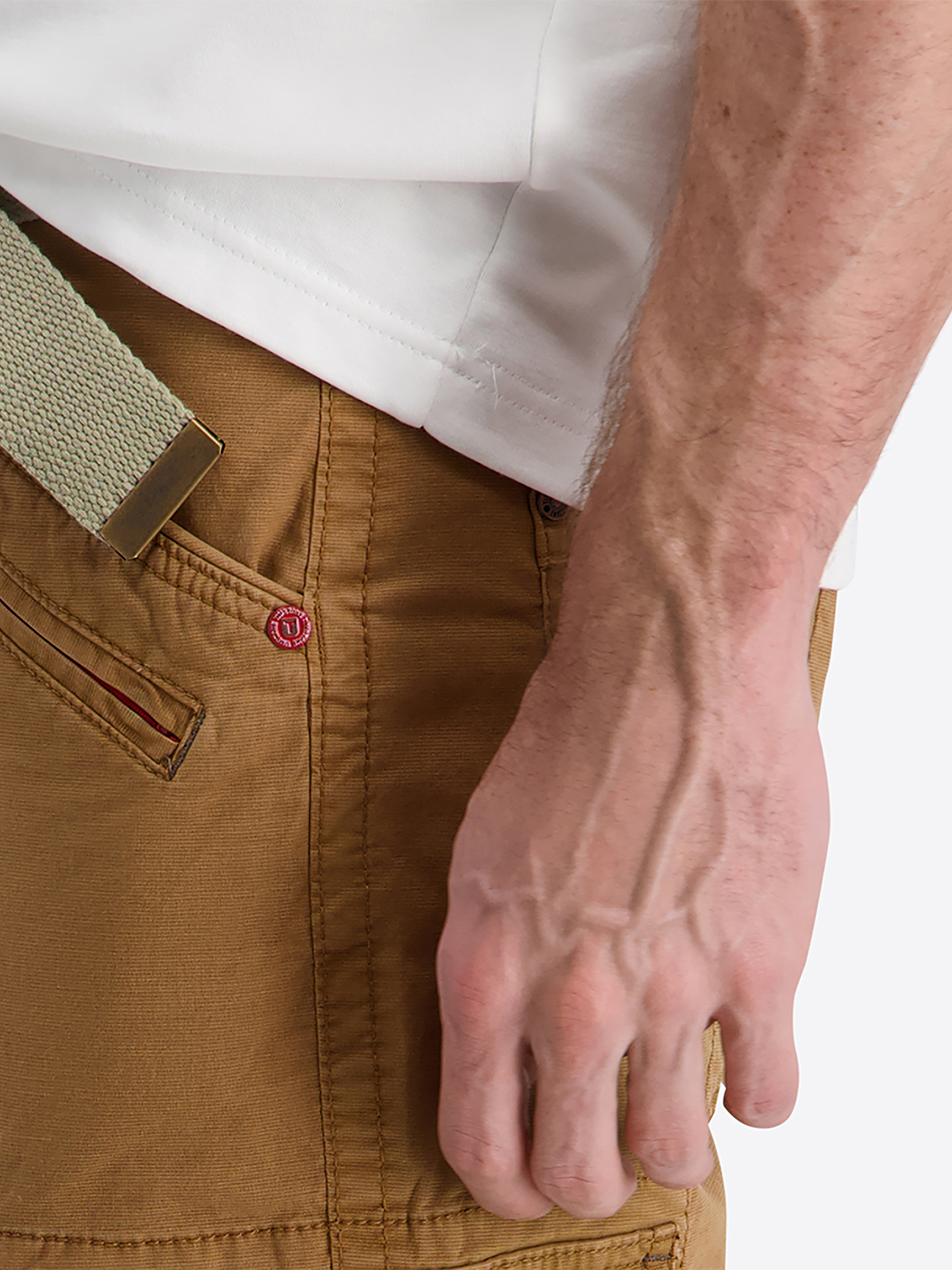Der integrierte Gürtel und der verdeckte Zip-Fly-Verschluss sorgen für eine sichere Passform.